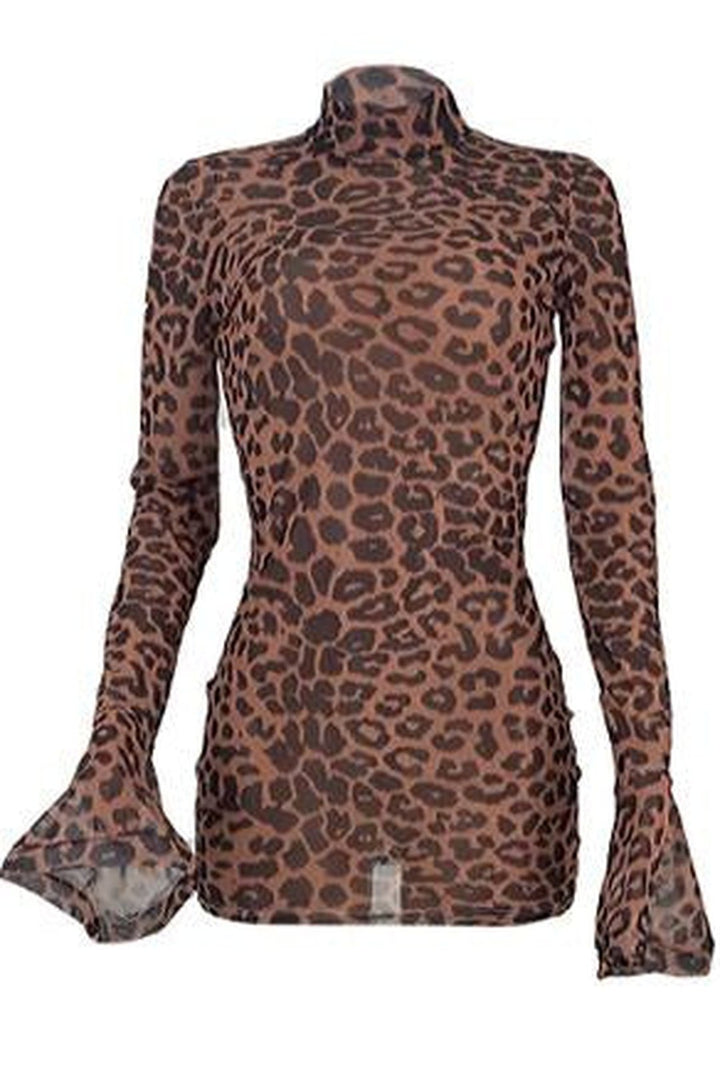 *Sheer Leopard Print Trumpet Sleeve Mock-Neck Mini Dress